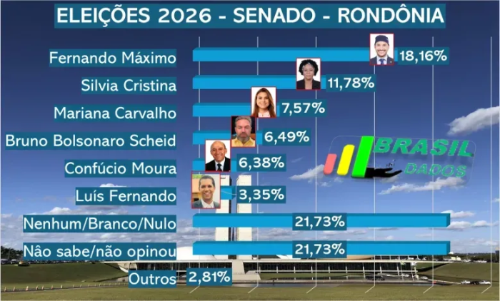 Porto Velho, RO - Os números mais recentes divulgados pelo Instituto Brasil Dados colocam o deputado federal Fernando Máximo na liderança da corrida, com 18,16% das intenções de voto. Logo atrás, a deputada federal Silvia Cristina aparece consolidada no segundo lugar, com 11,78%. Os dados refletem um eleitorado atento, mas ainda altamente indeciso, com um índice de 43,46% de eleitores que declaram voto nulo, branco ou que não souberam opinar.